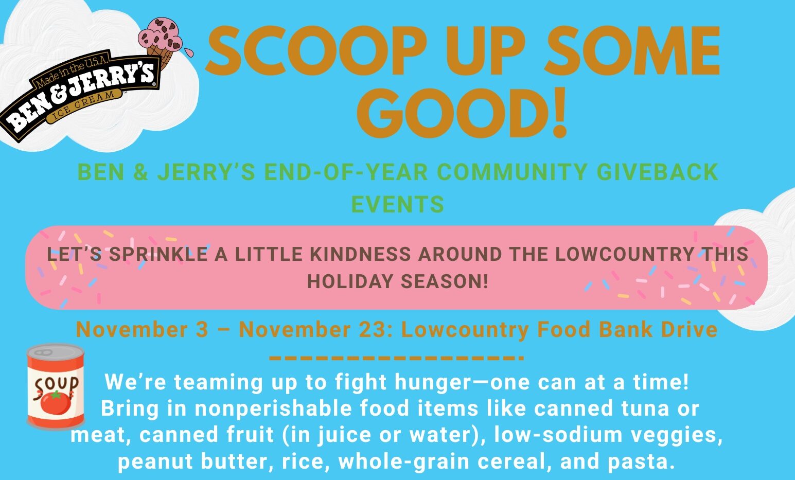 Ben & Jerry's is teaming up with Lowcountry Food Bank to fight hunger one can at a time! Bring in non-perishable food items like canned tuna or meat, canned fruit, veggies, peanut butter, rice, whole grain cereal and pasta now through November 23rd. As a thank you for sharing the love, everyone who donates will...