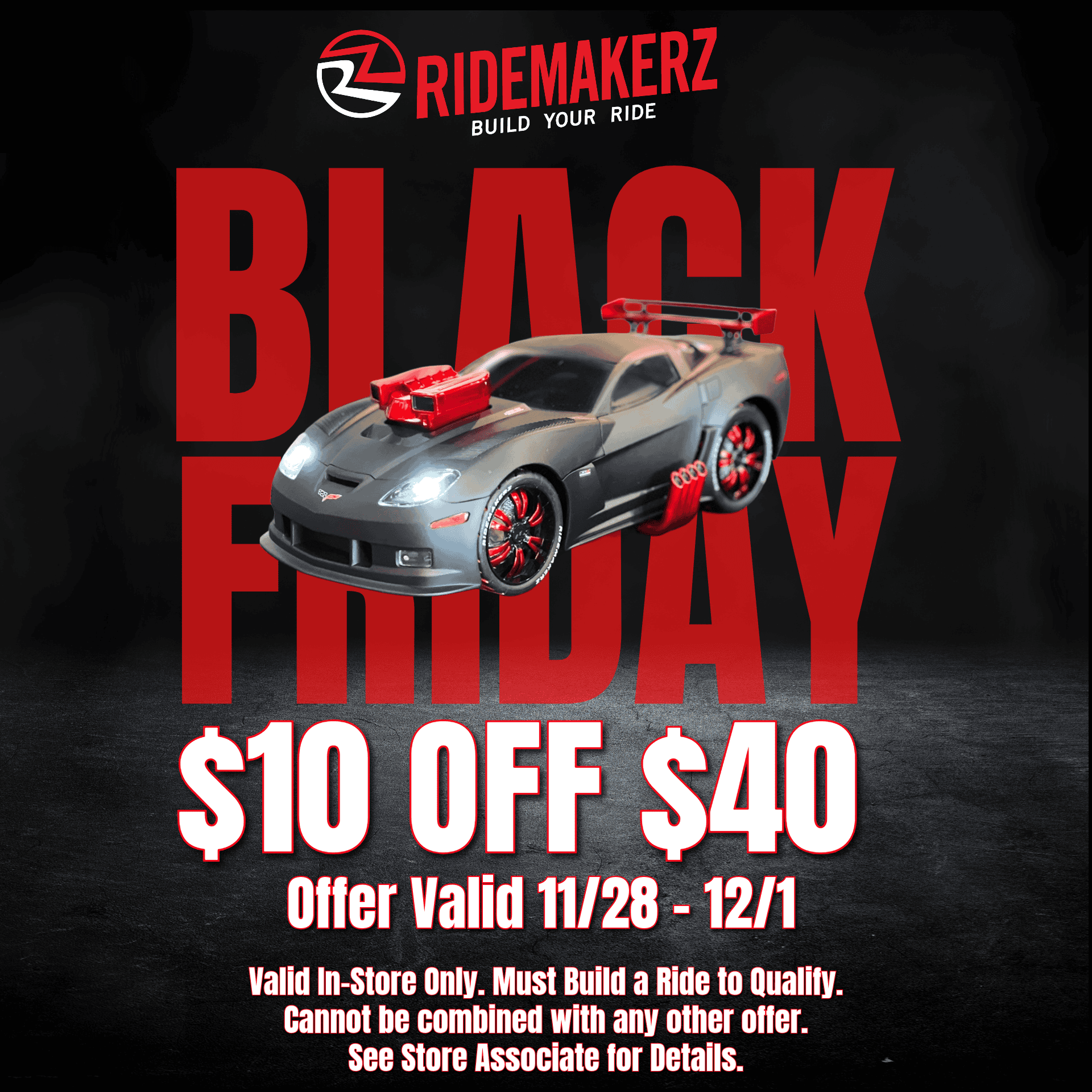 For Black Friday weekend, Ridemakerz is running a special for $10 off a Ride Purchase of $40 or more for In Shop customers. This offer will go from 11/28 through close of business on 12/1. Must Build a Ride to Qualify. Cannot be combined with any other offer.